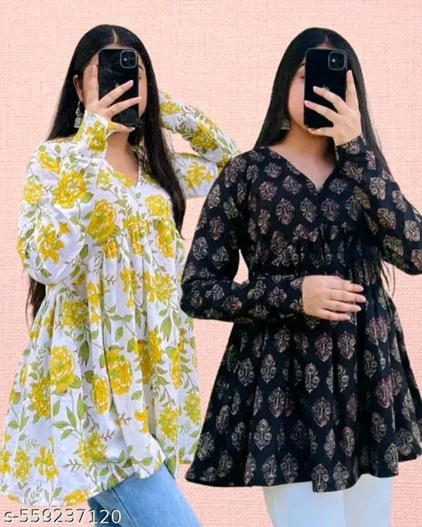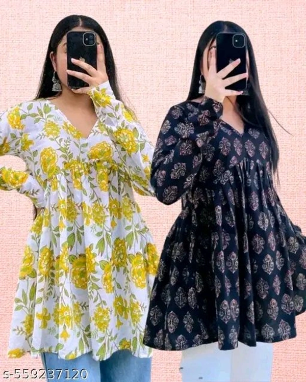 Name: Combo of 2 Short Cotton Kurtis for Women | Stylish Printed Empire Tops for Daily & Office Wear | V-Neck Ethnic Tops for Jeans | Summer Collection 2025