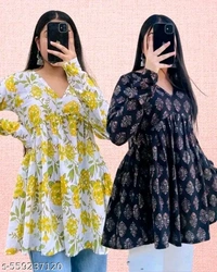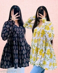 Both kurtis feature a V-neckline, gathered waist, and relaxed A-line flare, making them suitable to pair with jeans, palazzos, or leggings. Whether you're heading to work, class, or just out with friends, these tops keep you cool, comfy, and stylish.